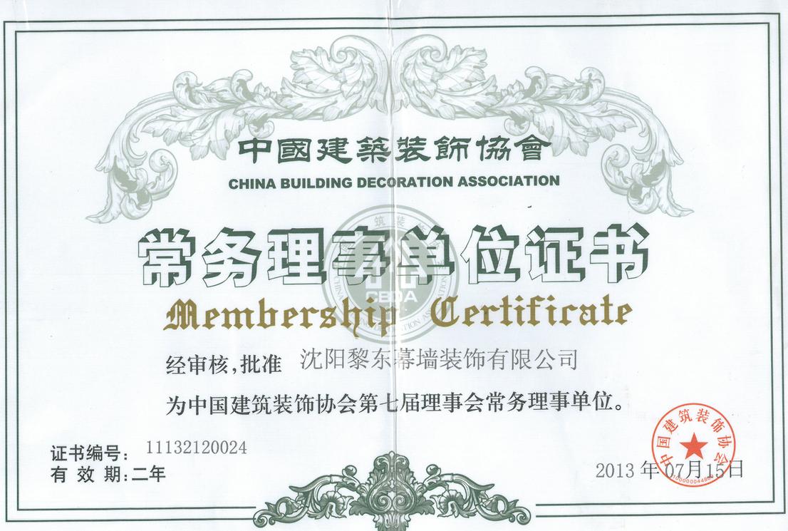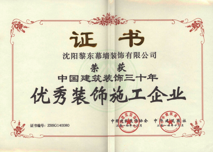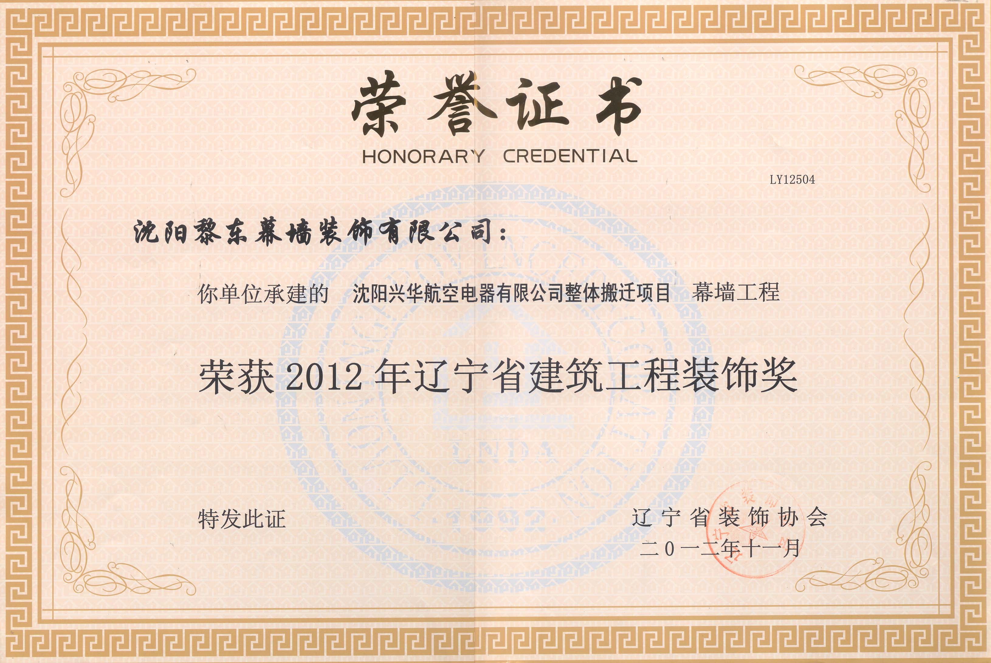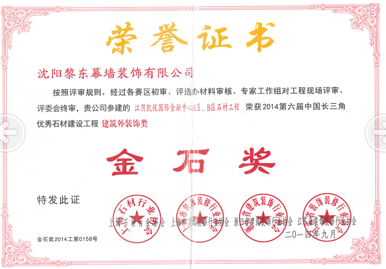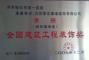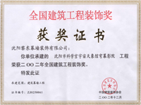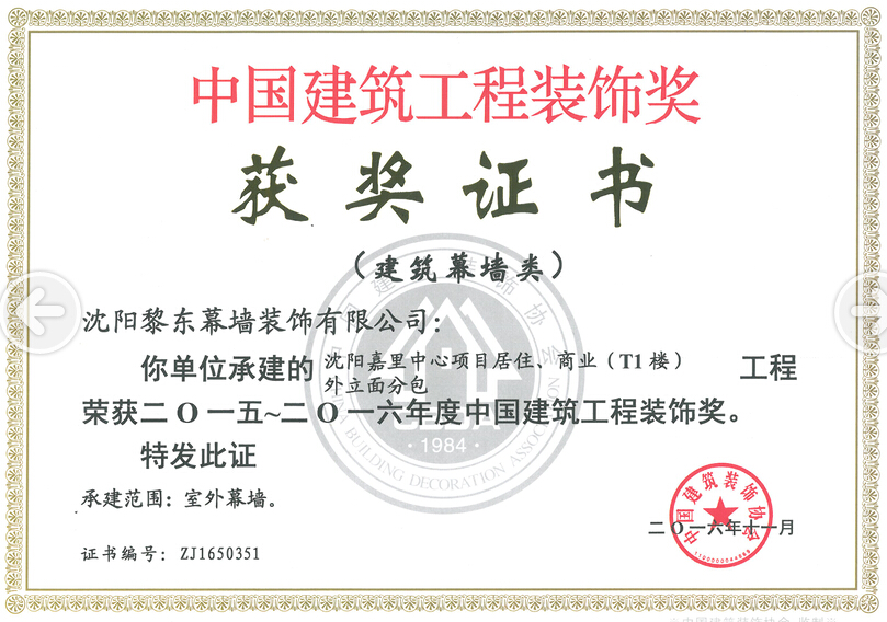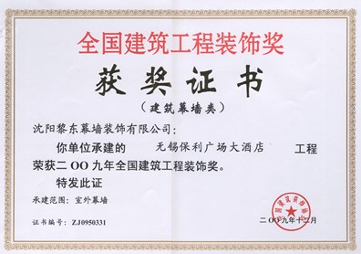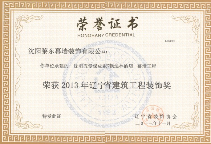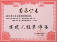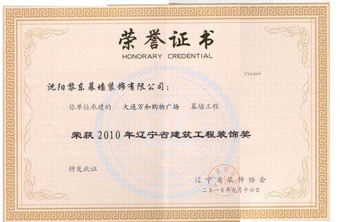 | 2010年榮獲遼寧省裝飾裝修行業(yè)優(yōu)秀企業(yè)家 | 2012年榮獲全國建筑幕墻行業(yè)50強(qiáng)企業(yè) | 2012年榮獲沈陽市守合同重信用單位 |