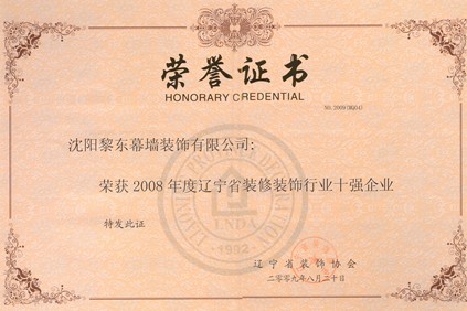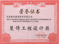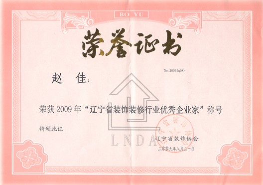| 2009年獲無錫保利廣場大酒店全國建筑工程裝飾獎(jiǎng) | 2009年趙佳獲遼寧省裝飾裝修行業(yè)優(yōu)秀企業(yè)家 | 2009年度遼寧省裝修裝飾行業(yè)十強(qiáng)企業(yè) |