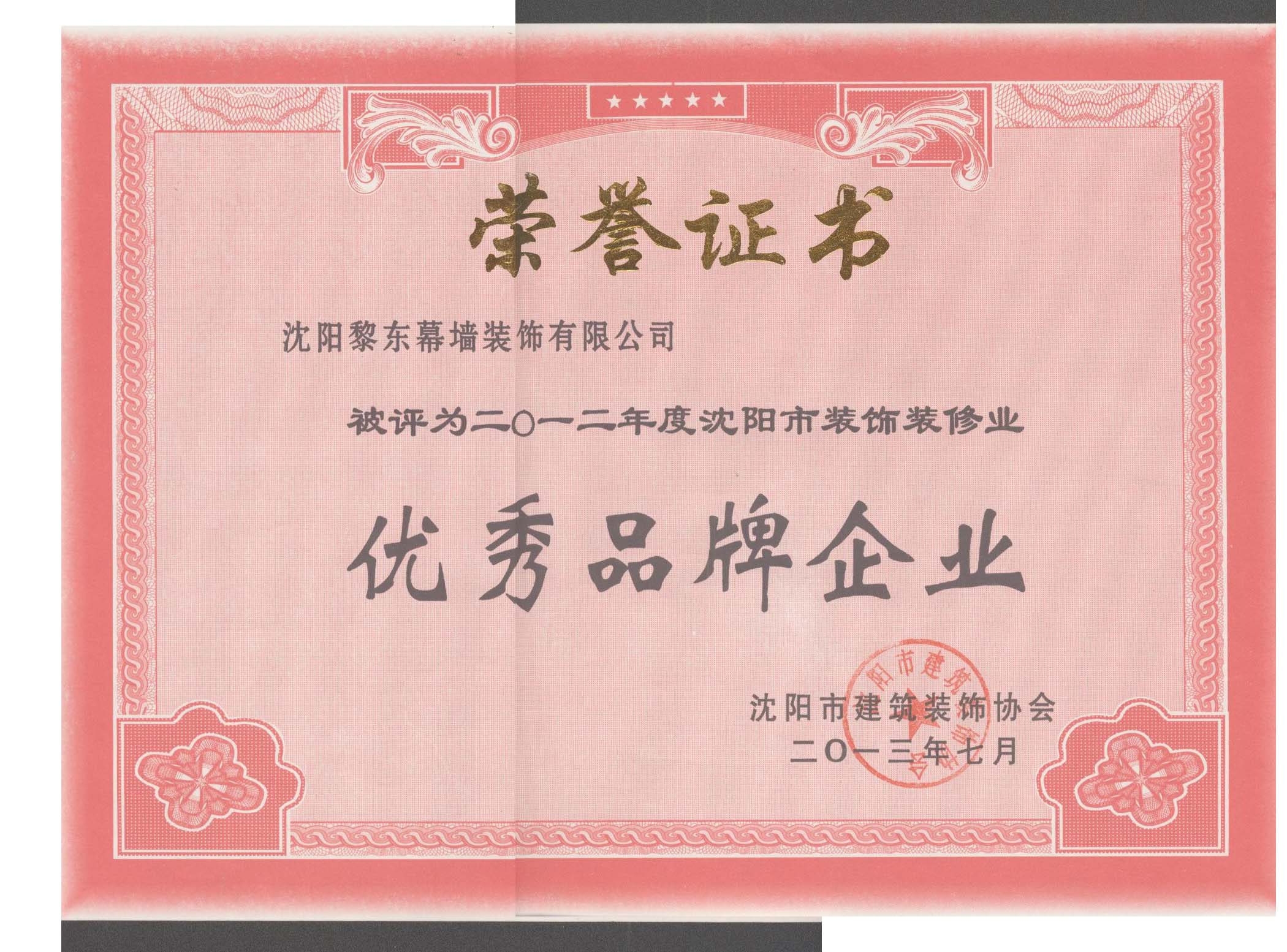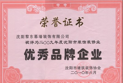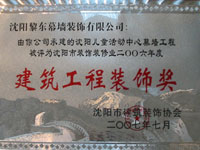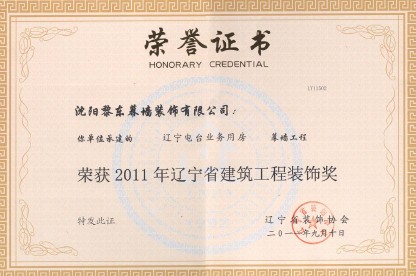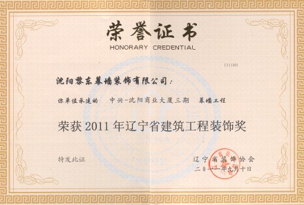 | 2011年遼寧電臺業(yè)務(wù)用房幕墻工程榮獲遼寧省建筑工程裝飾獎(jiǎng) | 2011年中興——沈陽商業(yè)大廈三期榮獲遼寧省建筑工程裝飾獎(jiǎng) | 2011年被評為沈陽市裝飾裝修業(yè)優(yōu)秀品牌企業(yè) |