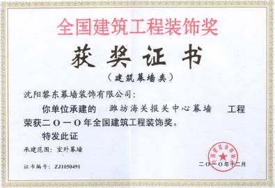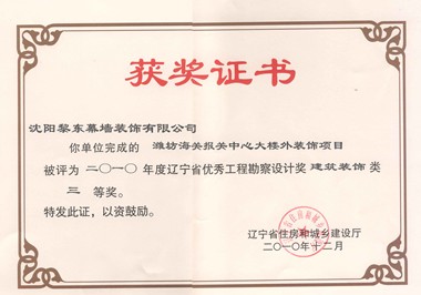 | 2011年獲大連萬和購物廣場遼寧省建筑工程裝飾獎(jiǎng) | 2010年獲濰坊海關(guān)報(bào)關(guān)中心大樓外裝飾優(yōu)秀勘察設(shè)計(jì)獎(jiǎng) | 2010年獲濰坊海關(guān)報(bào)關(guān)中心全國建筑工程裝飾獎(jiǎng) |