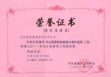 | 2010年獲守合同重信用單位 | 2010年榮獲遼寧省裝飾裝修行業(yè)建筑幕墻專業(yè)十強(qiáng)企業(yè) | 2011年河北質(zhì)量檢驗(yàn)檢測大樓外裝飾工程榮獲河北省建筑工程裝飾獎(jiǎng) |