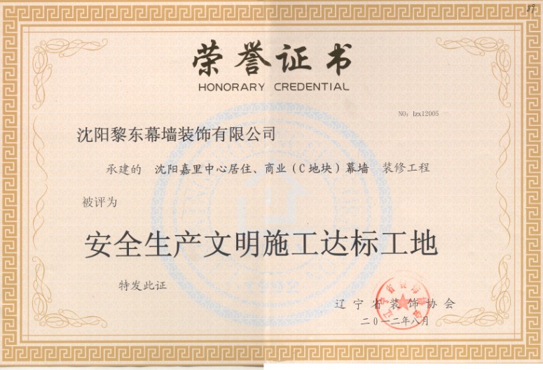 | 2011年榮獲沈陽市守合同重信用單位 | 2012年嘉里中心榮獲安全生產(chǎn)文明施工達(dá)標(biāo)單位 | 2012年長春市市政府新建辦公樓榮獲遼寧省裝飾裝修行業(yè)科技創(chuàng)新成果獎(jiǎng) |