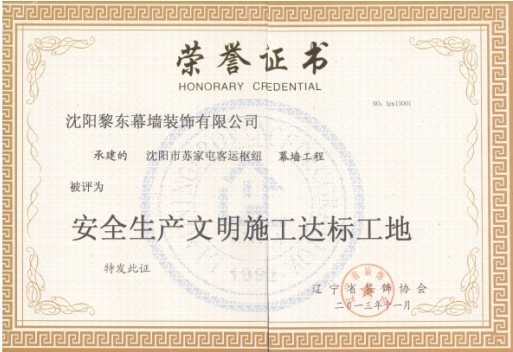 | 2013年沈陽市蘇家屯客運(yùn)樞紐工程被評為安全生產(chǎn)文明施工達(dá)標(biāo)工地 | 2013年榮獲遼寧省裝飾裝修行業(yè)優(yōu)秀項(xiàng)目經(jīng)理 | 2012年榮獲全國建筑幕墻行業(yè)50強(qiáng)企業(yè) |