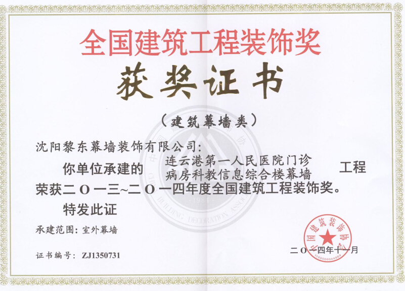 | 2014年獲中國建筑裝飾三十年優(yōu)秀裝飾施工企業(yè) | 2014年獲中國建筑幕墻行業(yè)百強(qiáng) | 2013-2014年獲連云港第一人民醫(yī)院裝飾獎(jiǎng) |